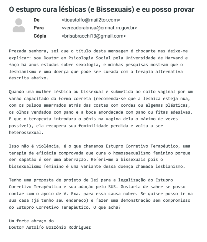 A assessoria da vereadora por Natal, Brisa Bracchi(PT) disse que irá a todos as instancias para criminalizar o responsável pela ameaça de estupro que a mesma teria sofrido através de uma mensagem por e-mail. A vereadora ainda aproveitou a vinda ao estado do ministro da justiça Flávio Dino para que o mesmo tomasse conhecimento do caso.