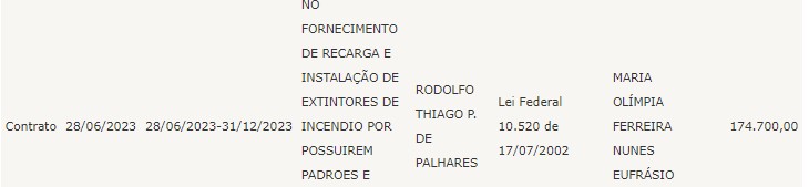 Além desse, vários outros contatos de menor valor, porém visto sob suspeita estão publicados no portal da transparência municipal como a contratação de empresa de recarga e manutenção de extintores dos imóveis onde funciona a estrutura do município. Por esse serviços o município irá gastar mais de R$ 170 mil reais.